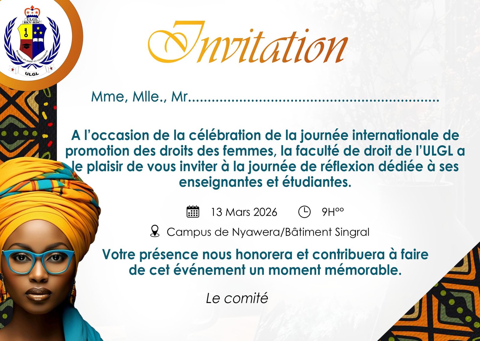 Vous êtes invités à cette journée de réflexion sur les droits de la femme, que vous soyez étudiante, étudiant, enseignante et enseignant, chercheur.